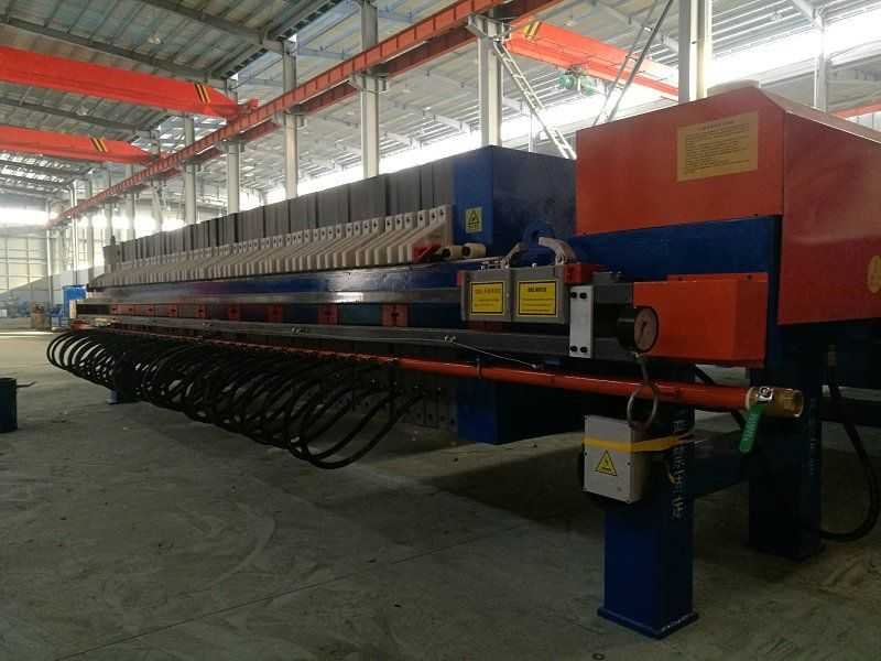 液壓廂式壓濾機由交替排列的濾板和濾框構成一組濾室。濾板的表面有溝槽,其凸出部位用以支撐濾布。濾框和濾板的邊角上有通孔,組裝后構成完整的通道,能通入懸浮液、洗滌水和引出濾液。板、框兩側各有把手支托在橫梁上,由壓緊裝置壓緊板、框。板、框之間的濾布起密封墊片的作用。由供料泵將懸浮液壓入濾室 在濾布上形成濾渣,直至充滿濾室。濾液穿過濾布并沿濾板溝槽流至板框邊角通道,集中排出。過濾完畢,可通入清洗滌水洗滌濾渣。